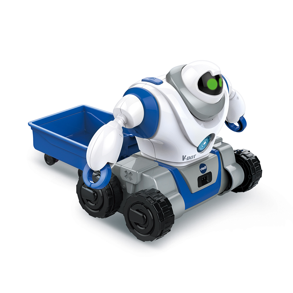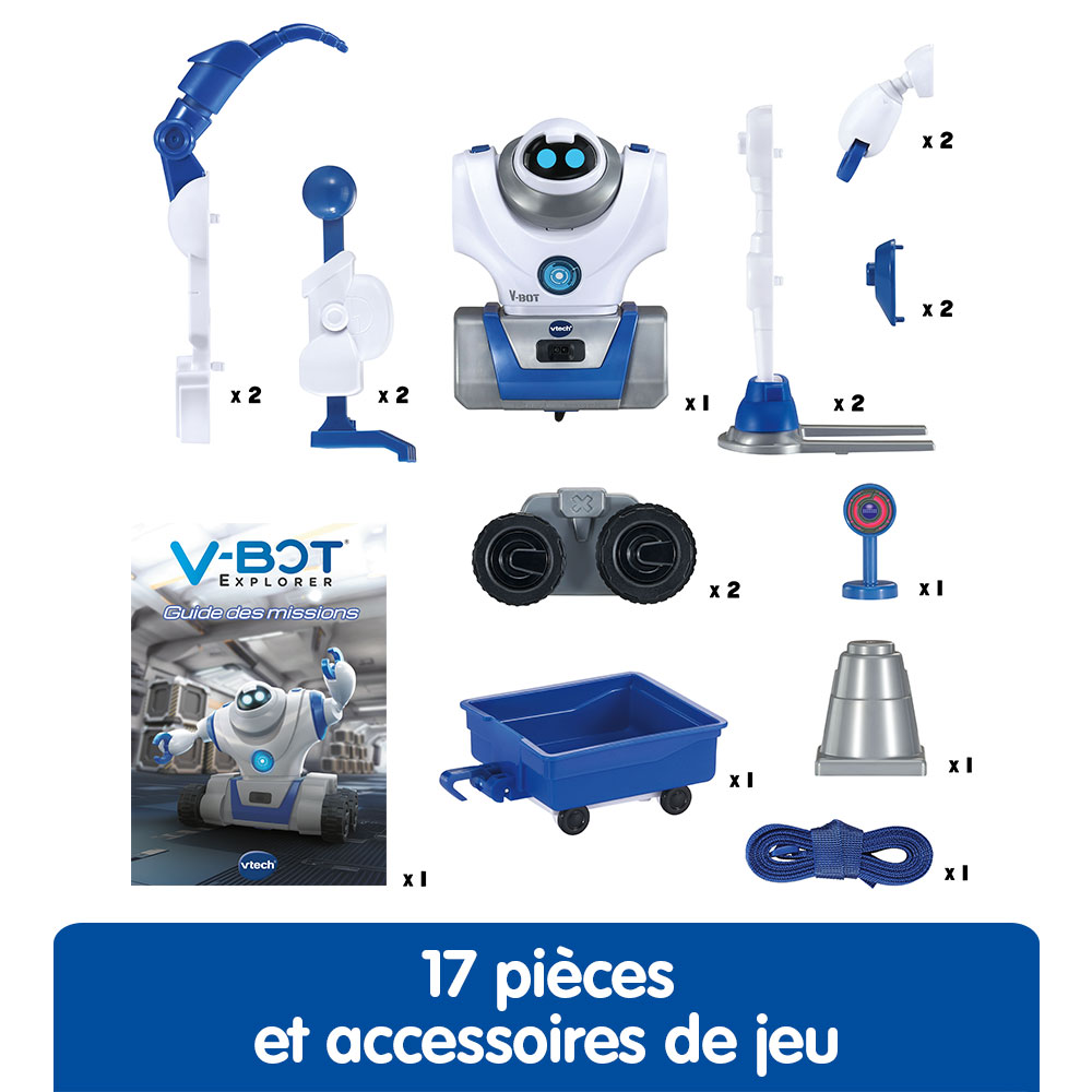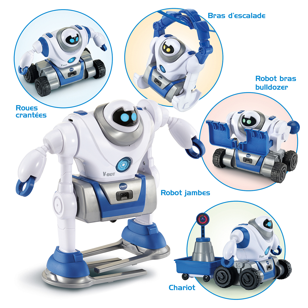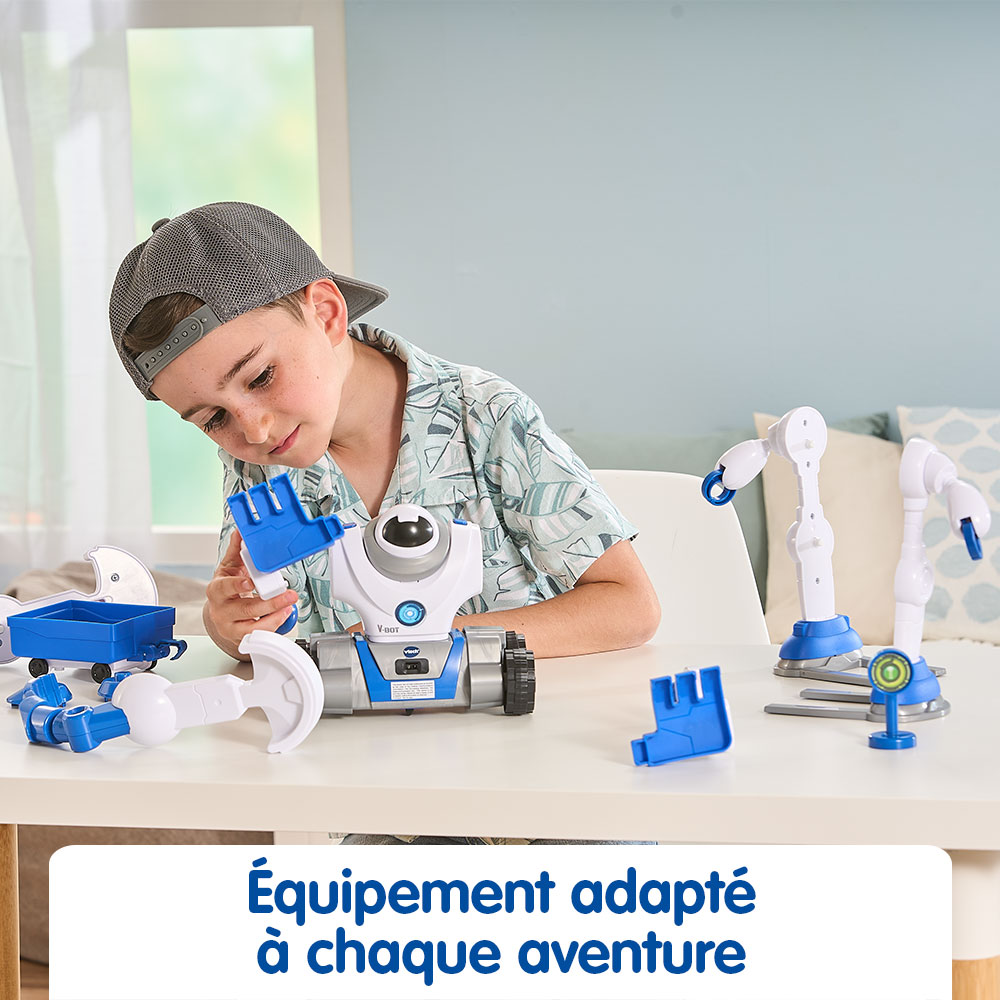 V-Bot Explorer est un robot transformable et programmable, riche en accessoires, qui se déplace, évite les obstacles, parle et réagit aux sons. Grâce à ses yeux expressifs, ses détecteurs intelligents et ses 5 transformations, votre enfant s’immerge dans de véritables missions interstellaires.